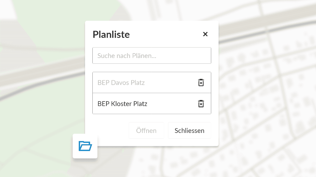 Um Ihre gespeicherten Pläne wieder zu öffnen, steht Ihnen das neue Werkzeug "Planliste" zur Verfügung. Nach Klick auf dieses Symbol erscheint ein Dialog mit der Liste aller bislang gespeicherten Pläne. Hier können Sie einen bestehenden Plan öffnen. Ebenso können Sie durch Klick auf das Mülleimer-Symbol alte Pläne löschen.